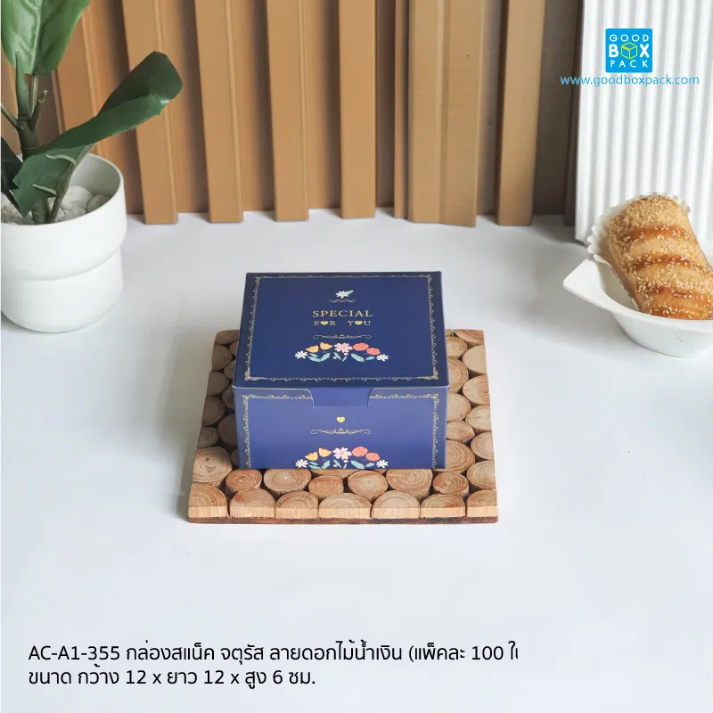 กล่อง Easy snack จตุรัสขาว พิมพ์ลายดอกไม้น้ำเงิน
